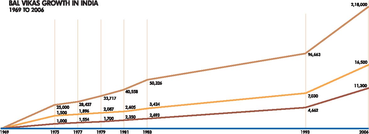 Steady Global GrowthSai Spiritual Education has now spread to all parts of the world. The growth of the Bal Vikas (SSE) programme in India where the programme originated in 1969 has been the most significant. In 1975 there were an estimated 25,000 children in India attending Bal Vikas classes. By 2006 the programme had grown to 218,000 children taught by 16,500 teachers. Table 1 demonstrates the status of participation as in July 2006. Outside India, the regional breakdown of different countries also demonstrates a high uptake of SSE. In Table 2, the steady growth of SSE students and teachers is illustrated by data from Malaysia.