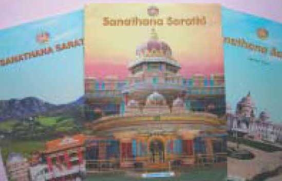 Sri Sathya Sai Baba's Discourses and Sanathana Sarathi"Sanathana Sarathi" is a monthly magazine published by Sri Sathya Sai Books and Publications Trust in Prasanthi Nilayam. This magazine is devoted to the moral and spiritual uplift of humanity through the five human values. "Sanathana Sarathi" gives Sri Sathya Sai Baba’s latest discourses and has articles by eminent contributors, mostly educators. The collected discourses along with the whole range of spiritual books are available at the Sri Sathya Sai Books and Publications Trust Bookstore in Prasanthi Nilayam. "Sanathana Sarathi" gives updated report and news from Sathya Sai Centres around the world on educational and humanitarian projects. This magazine is distributed to all the countries with Sathya Sai Centres and has a powerful role in motivating the devotees to commit themselves to a spiritual life based on Sri Sathya Sai Baba’s teachings. |