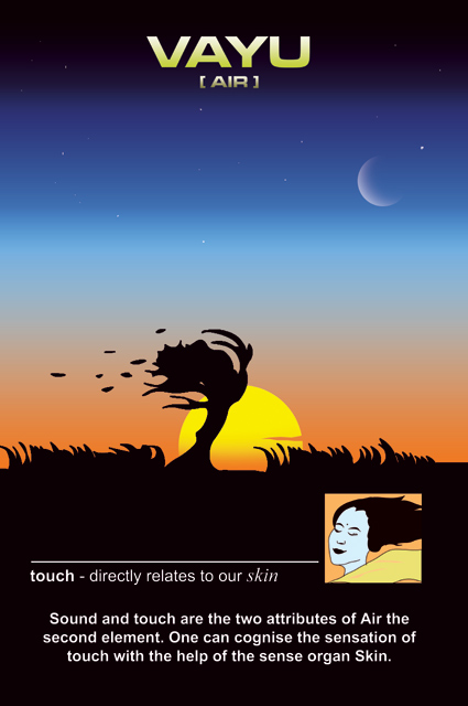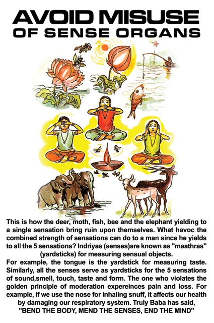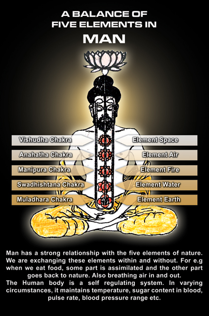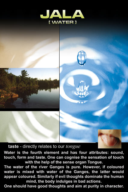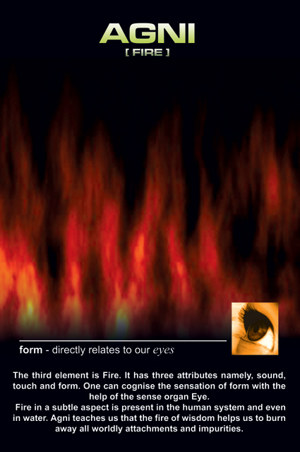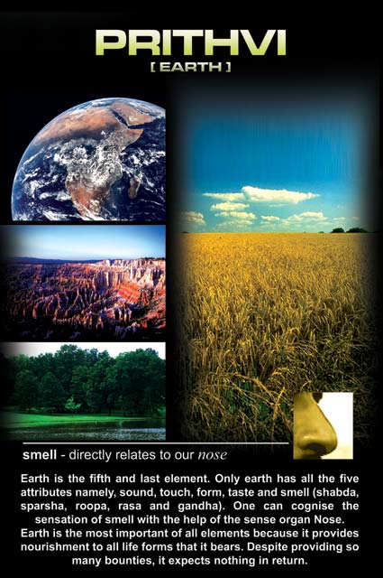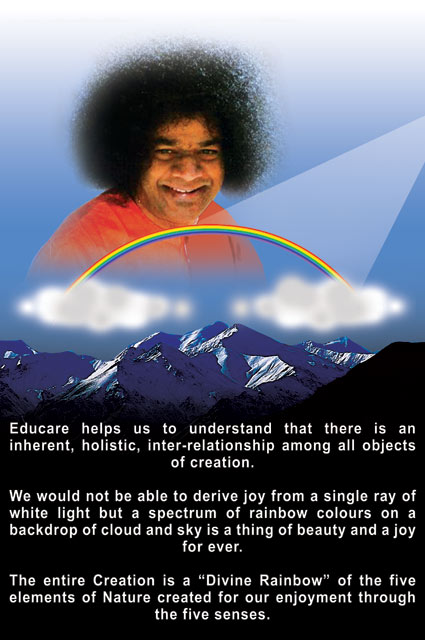Educare helps us to obtain knowledge of the creation of the universe, the five elements that exist in all creations, their properties, the holistic relationship between different objects in creation, and the manner of usage of our five senses in enjoying creation, which is but a Divine rainbow created for our pleasure. The five elements are: space, air, fire, water, and the earth. Each of these has one or more attributes, but earth alone has all five attributes: shabda, sparsha, roopa, rasa, and gandha (sound, touch, form, taste, and smell) which are to be grasped by our five senses with restraint.