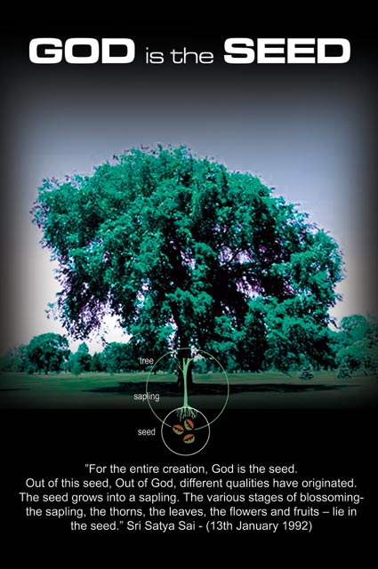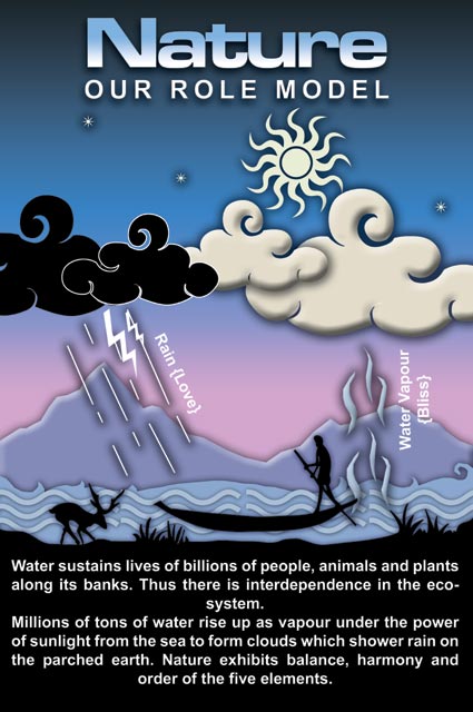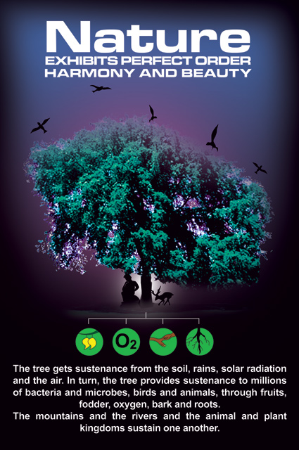 Bhagawan also tells us that nature, which exhibits qualities such as beauty, harmony, balance, peace, unity in diversity, self-regulation, and sacrifice, has many lessons for humankind. Dharma is described as the one factor that governs conduct of all objects in nature, animate or inanimate.