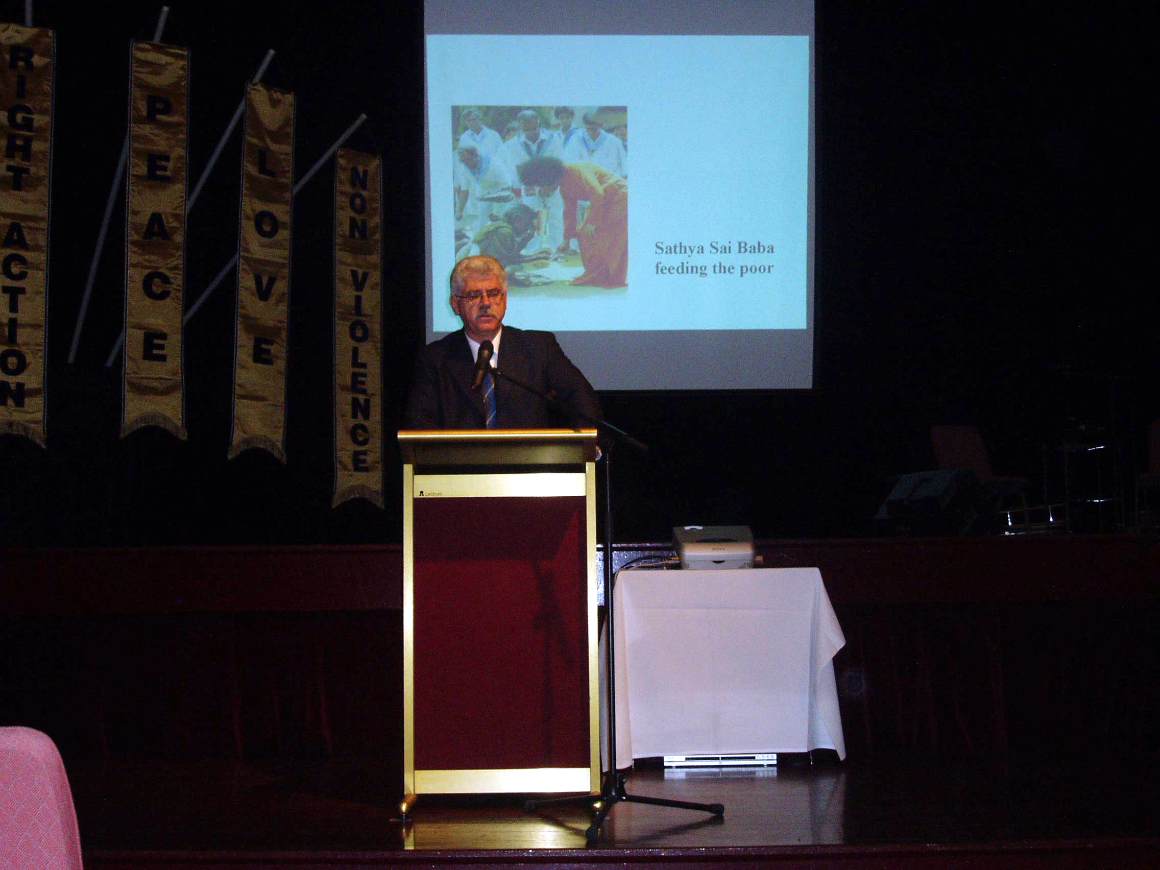 The meeting was preceded by a parade of the five human values banners.