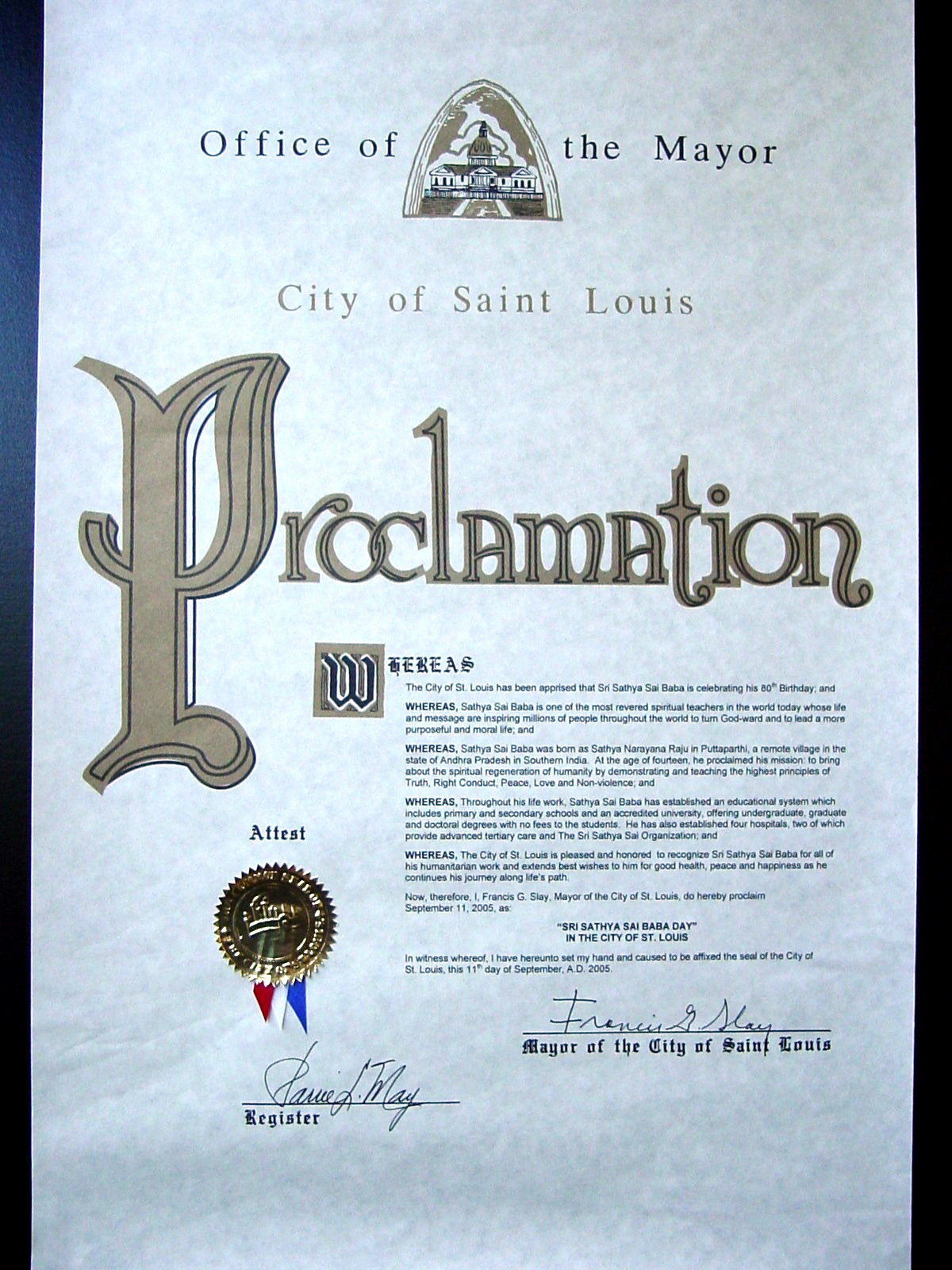 The public meeting in St. Louis --this day was proclaimed Sathya Sai Baba Day by the Mayor of St. Louis.