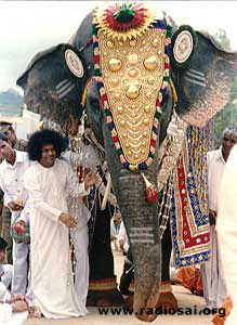 In the early sixties, the regular evening ‘appointment’ of Swami with Sai Geetha was a sight which devotees looked forward to with great anticipation and elation. She would wait at the gate on the ladies’ side (where Swami’s car now enters Sai Kulwant Hall) and, if for some reason darshan was delayed, she would get very impatient. Twisting and twirling her tiny trunk, intermittently flapping her lotus-leaf-sized ears vigorously, and her swift and strong legs jumpy and restless, she would eagerly look at the Mandir unable to bear the delay. When Swami came, it was a divine thrill in totality, not only for Sai Geetha but for every devotee witnessing the sublime play of pure love. Swami would first walk up to her, and she would almost kneel down --- her hind legs half-bent and front legs folded to the maximum extent possible. Her height now would be a mere two feet, and she would lift her tiny trunk up and down three times in salutation. After she had offered her prostrations at His feet, she would take a garland, raise her nimble trunk over the five feet frame of her beloved very carefully, and then with lots of glee slip it down Swami’s opulent hair onto His shoulders. Swami, in turn, would flash an enchanting smile, pat her cheeks so affectionately and would start speaking to her softly. Time would stand still watching the Lord so much at ease with His dear devotee. Like a teacher who is never tired of talking to his best student, the Lord too is most happy to be with His perfect devotee. Swami would then feed her. There would be a bag full of fruits (all offered at the shrine in the Mandir) and a bucket of teertham (consecrated liquid) for her to drink. One by one, Swami would put each apple (her favourite) in her mouth, and she would want to be fed no other way. “Even to this day,” Sri Pedda Reddy says, “she will not accept fruits from Swami on her trunk, she will insist that Swami put it personally in her mouth. But if it were anybody else, she will either refuse it or accept it only in her trunk.” Just like a child who is most comfortable and secure with her mother, Sai Geetha is in ‘peace and bliss’ only with her Swami.