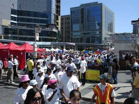 Walks for values in Canada took place on 10 June or 17 June in Calgary, Coquitlam, Edmonton, Kingston, Ottowa, Regina, Saskatoon, Toronto, and WInnipeg. In Toronto, where Walk for Value started several years ago, some 4,000 Toronto residents took part. Ontario government leaders took part in the inauguration of the Walk, and others participated in the multi-cultural program that ended the walk. Over 18 community groups took part, including diverse multi-cultural groups --Chinese, Irish, Russian, Laatin, Egyptian, and Indian groups performed at the closing ceremonies.A variety of food stalls, eshibits, and handicrafts dealing with Human Values were positioned at various places along the Walk.