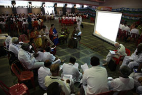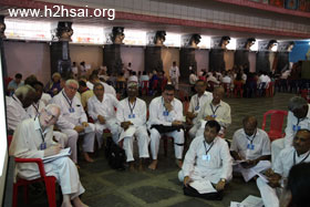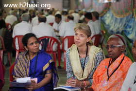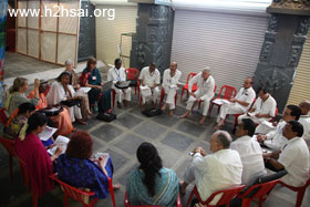 The first day's plenary session was held in the morning of 20 November. The opening ceremony and prayer was followed by an introductory talk by Dr. Michael Goldstein. The second speaker was Prof. David Gries, and he was followed by Dr. Narendranath Reddy. All three spoke succinctly and briefly on the goal of the Organisation, how one must conduct oneself in order to be a contributor toward that goal, and on the purpose of the study circles that were held directly after the talk. In these intense study circle sessions, all the delegates of a particular region literally formed circles to discuss issues and come up with ideas on improving the Sai Organization —how it could become anSai Ideal Organization. Two scribes in each study circle took notes, and these notes are being collated and summarized —this will take a few months. (Click on an image to enlarge it).