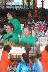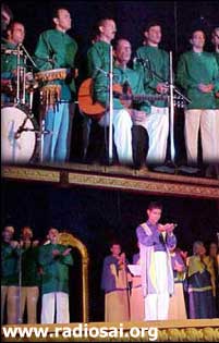 In November 2004, a group of professional Brazilian musicians presented Indian bhajans to Swami, utilizing Brazilian rhythms. The third time occurred on 1 January 2005, when the World Choir composed of 175 voices from 45 countries sang a song in Portuguese composed by a Brazilian conductor. The choir members felt moved while singing in Portuguese, a language unfamiliar to most of them. “Swami gently moved to the rhythm of the songs, making our hearts happy and enchanting us with His kindness and generosity,” say the devotees recalling those blissful moments.