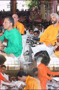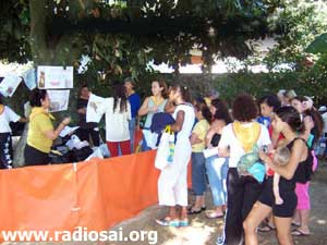 Brazilian Music Before the Lord “Swami blessed us in a very special way, allowing Brazilian music and rhythm to be heard in Prashanti Nilayam on three different occasions,” say the devotees with great jubilation, “The first was Guru Poornima in July 2002, when about thirty Brazilians chanted beautiful songs in Portuguese. They sang Brazilian classics for forty minutes, such as ‘Trenzinho Caipira’ from Villa Lobos, ‘Aquarela do Brasil’ from Ary Barroso, as well as many bhajans in Portuguese.”