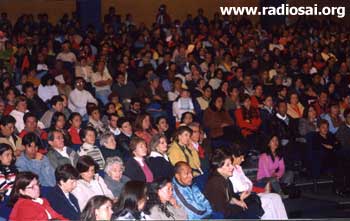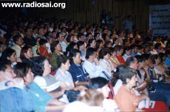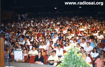 Once, some members of the Executive committee (every area has an executive committee to coordinate and promote the Sai activities) visited one of the centers in a deprived area of the city. They were informing the people about and inaugurating the recently created Medicare service. [Medicare was inaugurated in February 2005, and there are several doctors ready to offer service]. The people of the rural area were very grateful with Swami, and one lady even said that she would like to clean or do something else in return for the service she was going to receive. When hearts are touched with love, they are opened and devoted to serve, support, and help. Under special circumstances such as painful natural disasters, all the Sai Centres in Colombia help each other, and money contributions are sent through Fundasai in an organized manner to reach out to the distressed. The Other Joy-filled Spiritual Activities The Sai Organisation has held many public meetings apart from study circles, workshops on Human Values, and Sai Spiritual Education. In August 2004, the Sai Organisation organized a public meeting in the capital city of Bogota, the largest and the most populous city of the country with more than 7 million people. The meeting was addressed by Mr. Leonardo Gutter from Argentina and Mr. Billy Escalante from Peru.