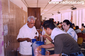 Hospital visits are also organized. The Sai youth group presents puppet shows at the children's hospital once a month, and refreshments are served to patients at the cobalt cancer treatment center since many of them travel long distances for their treatment without having eaten anything. And in the burn ward, doctors are using vibuthi in some cases