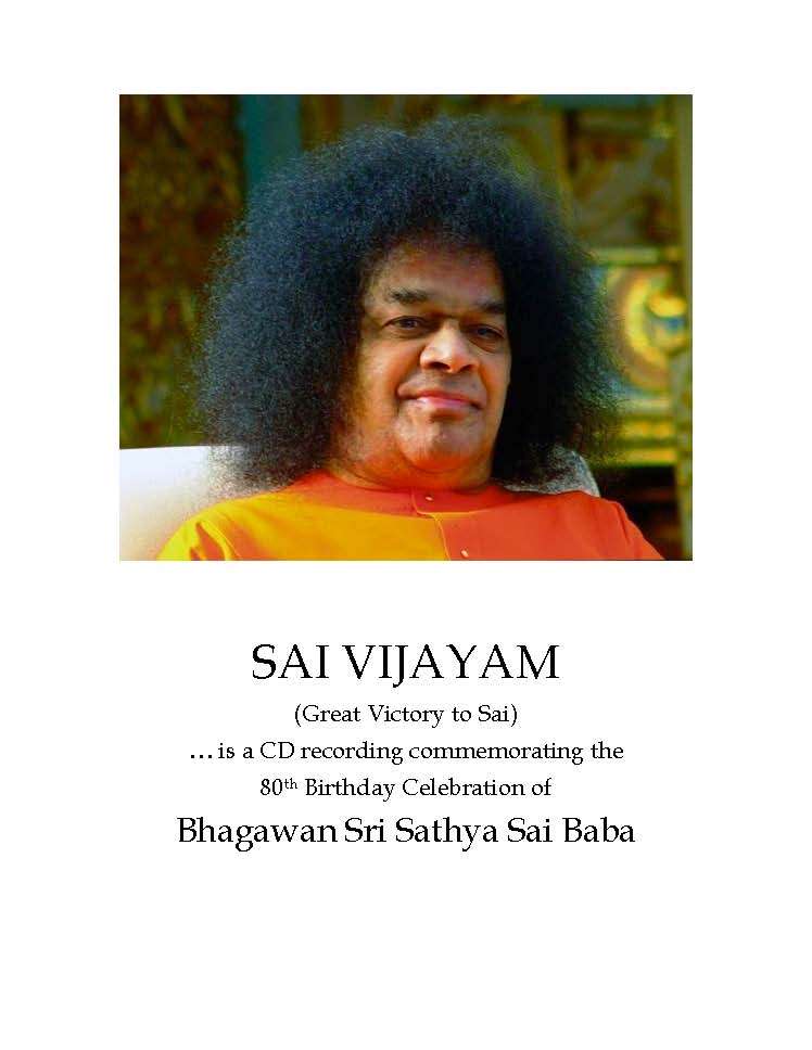 To obtain a small booklet Sai Vijayam that contains the text of the music, click on this: pdf file (392 KB, modified on 2006.04.10). Here is a Spanish version: pdf.