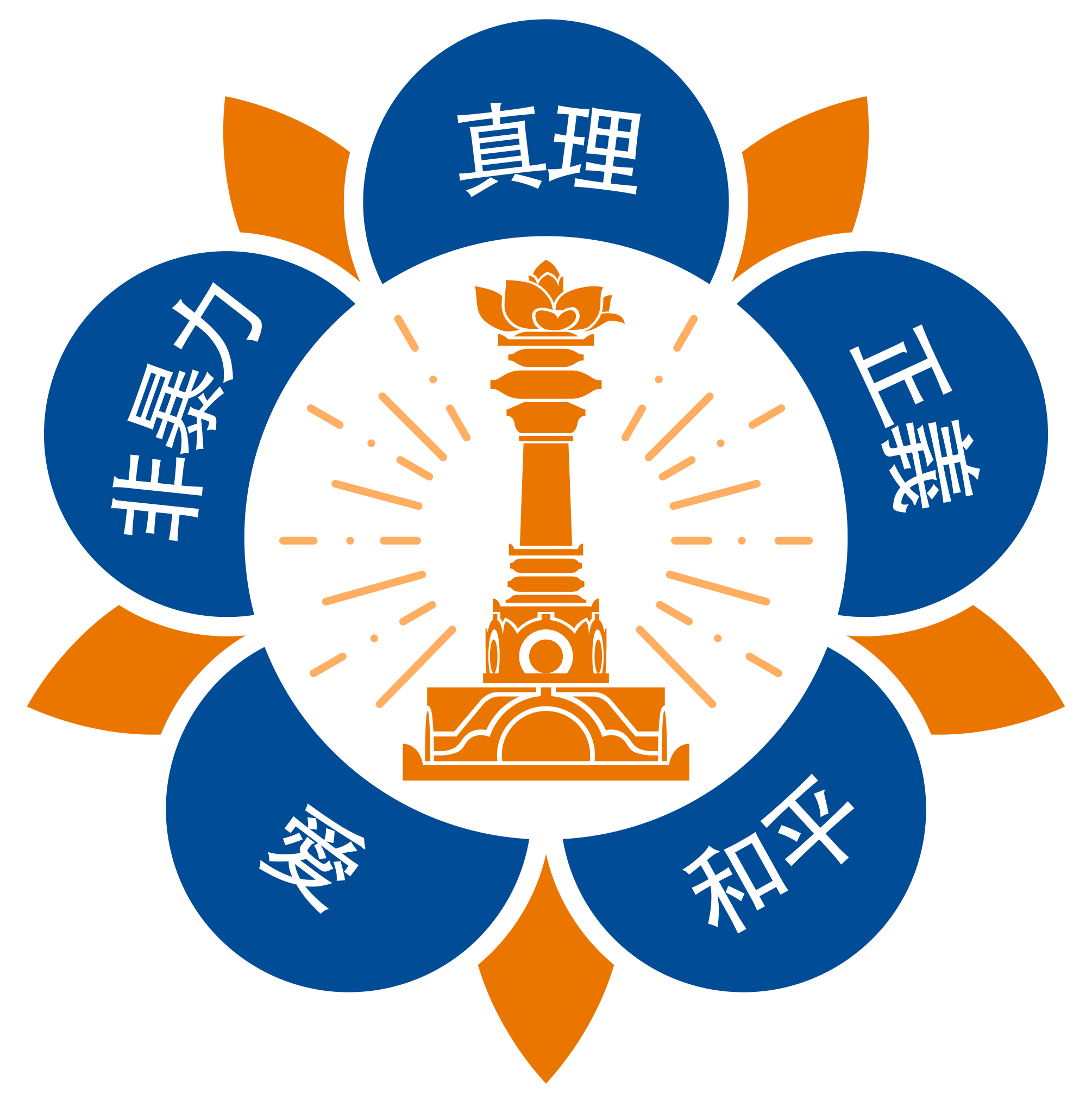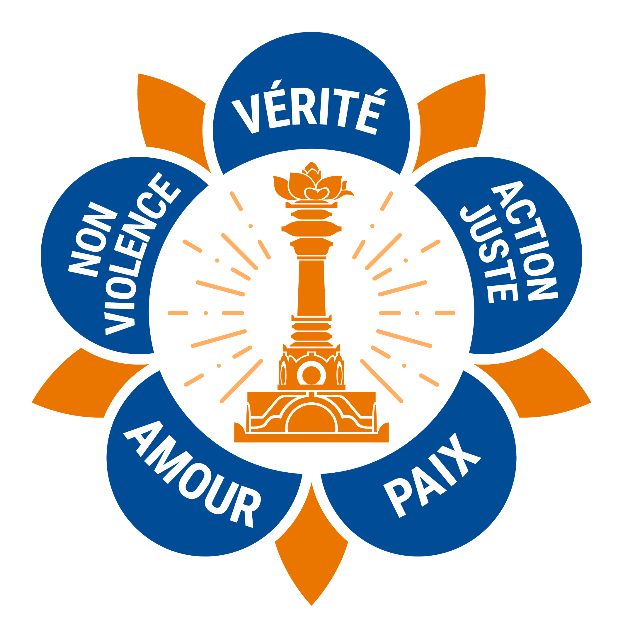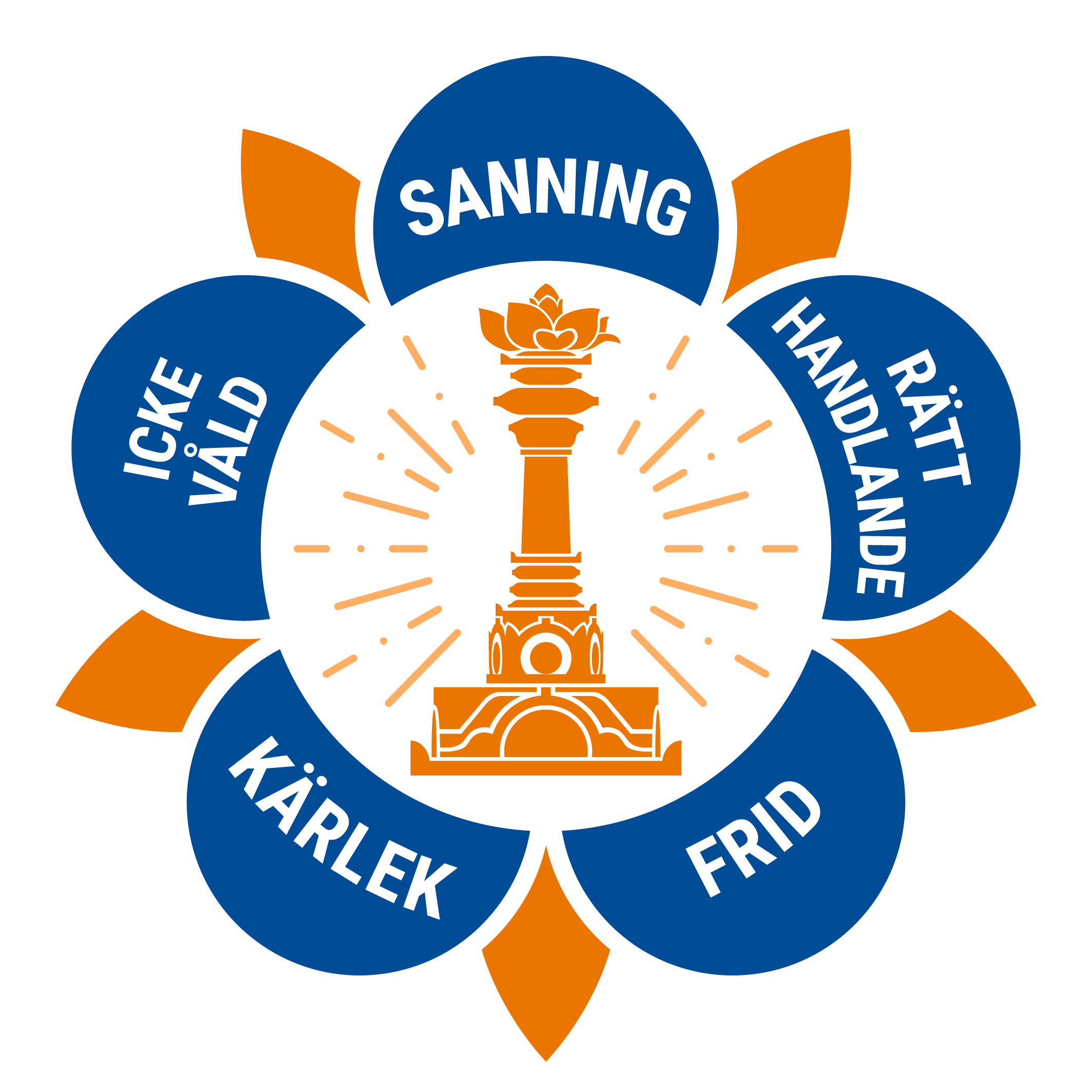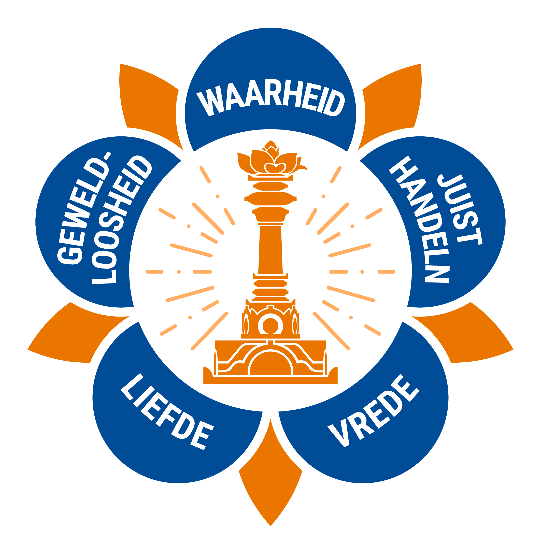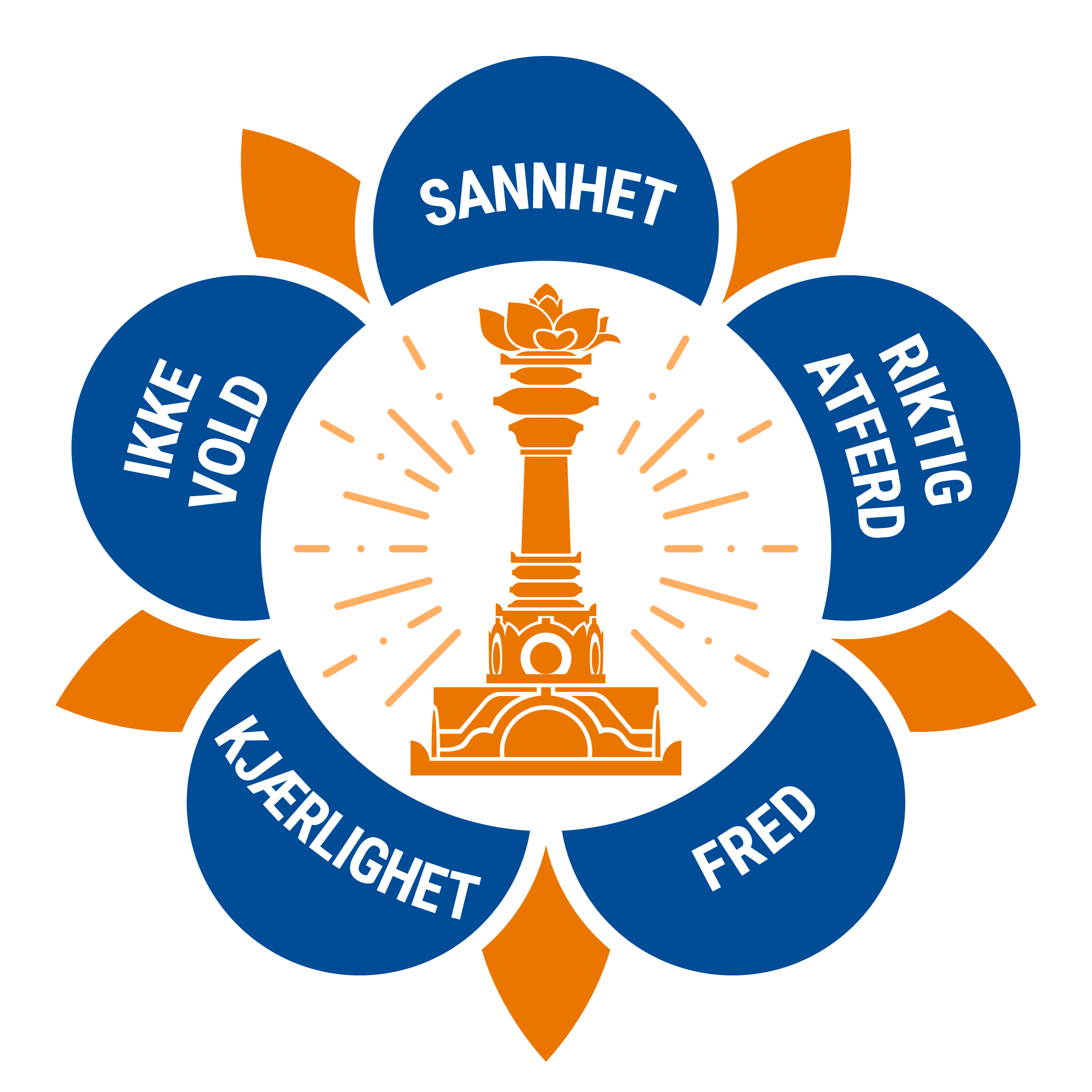 Also pictured in the logo is a tall pillar, called the sarva dharma stupa with a lotus flower on it. The sarva dharma stupa represents all religions and faiths of the world.