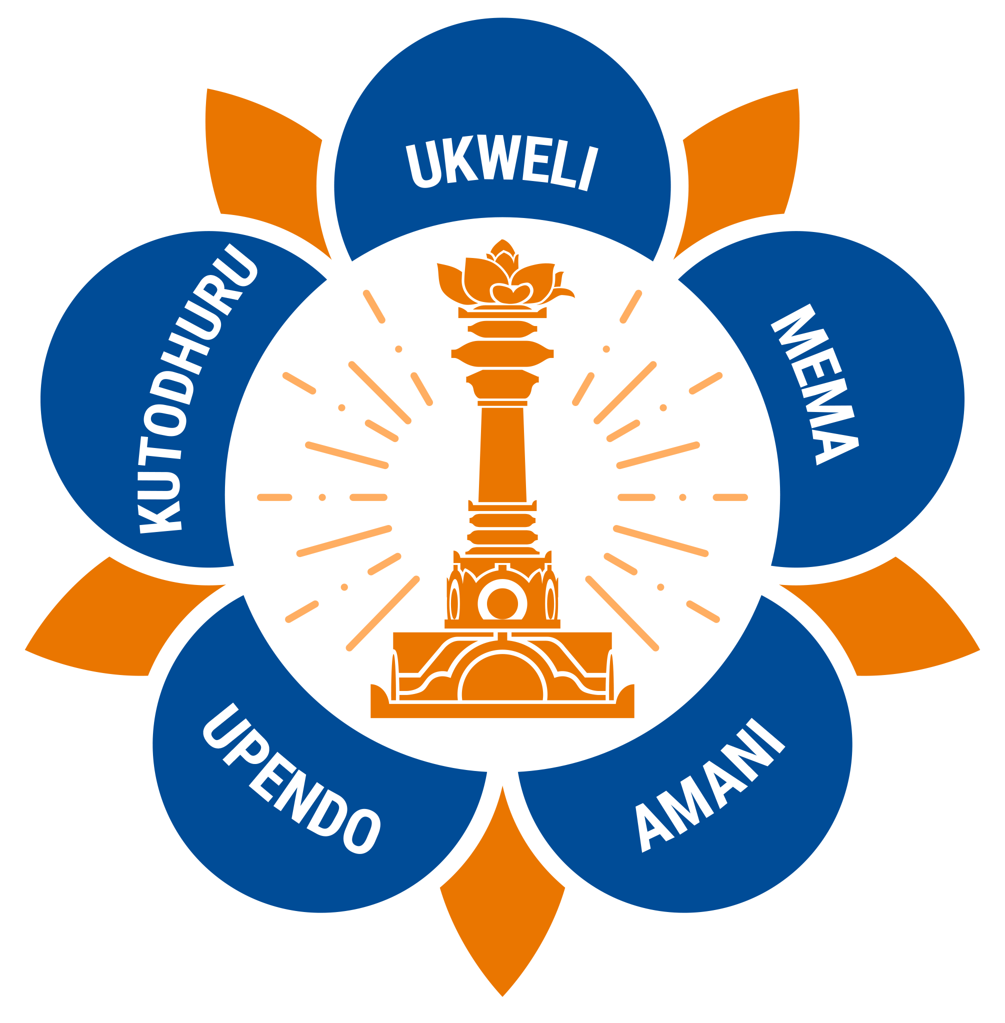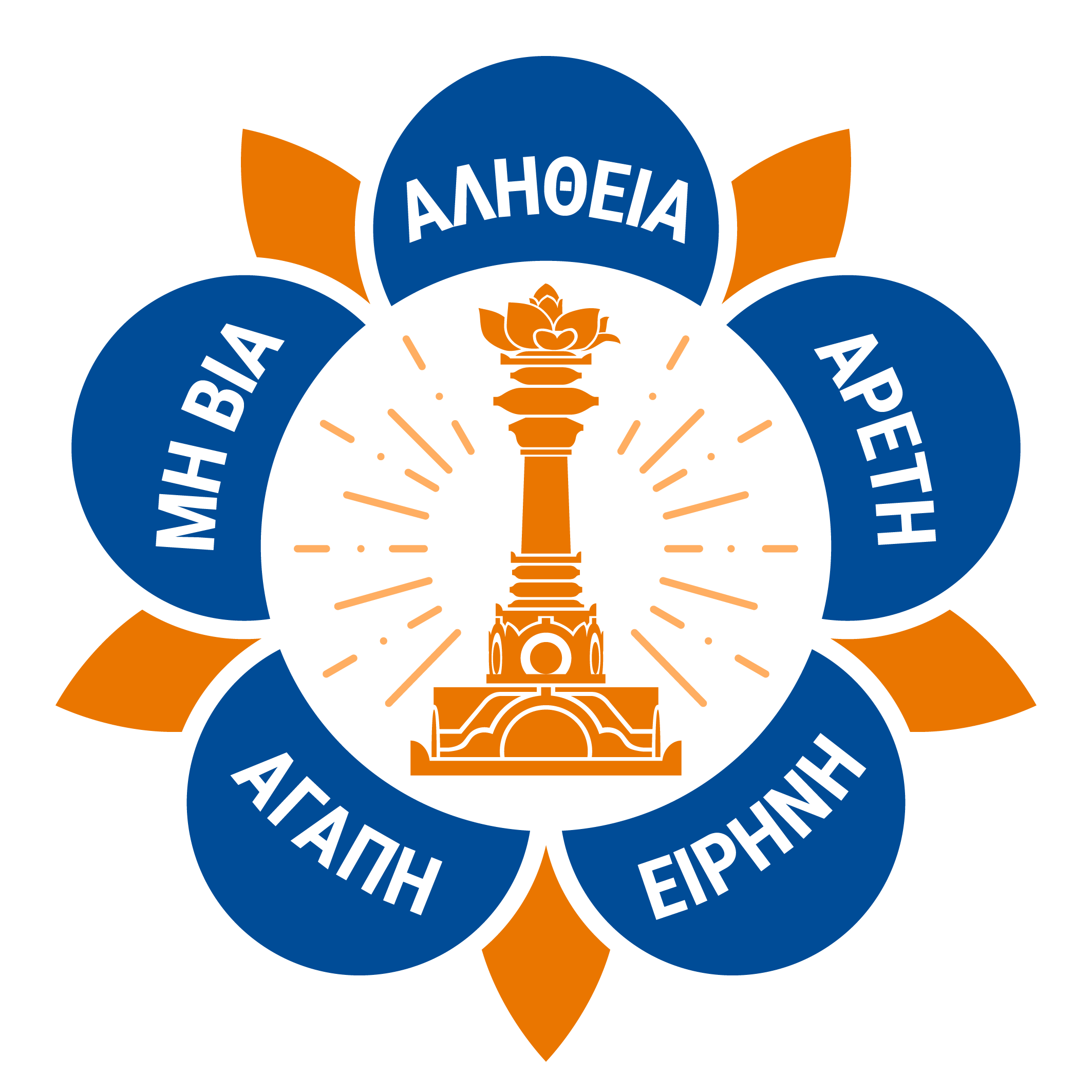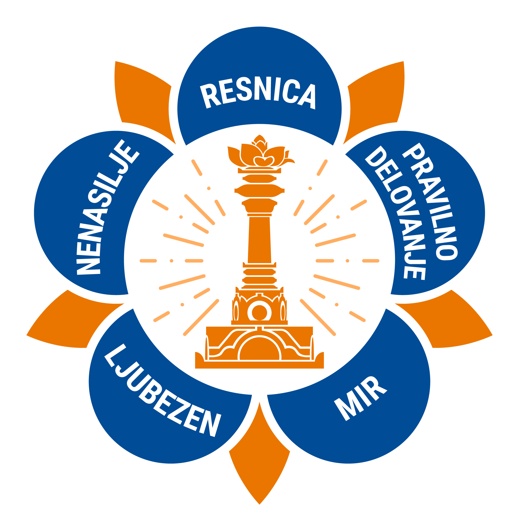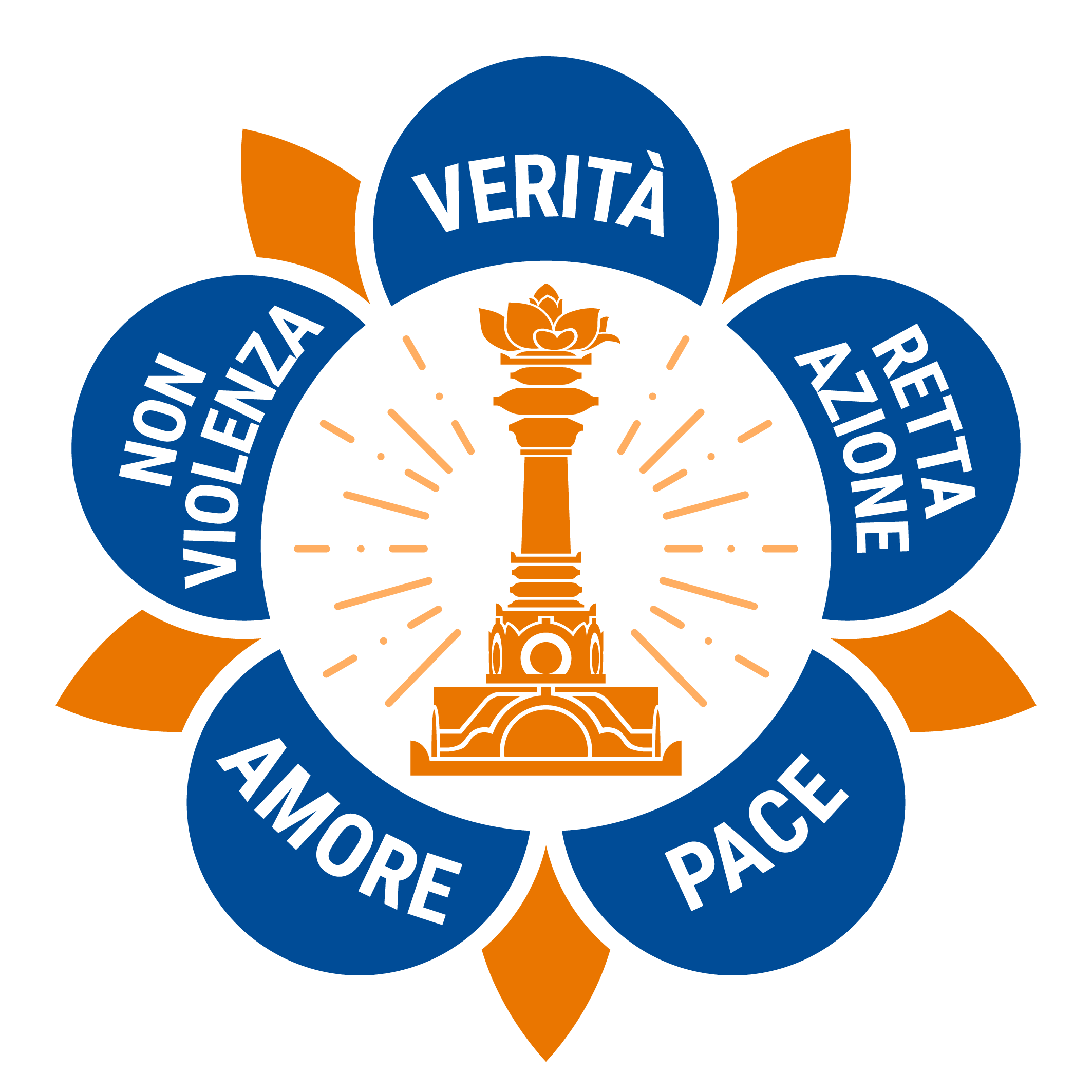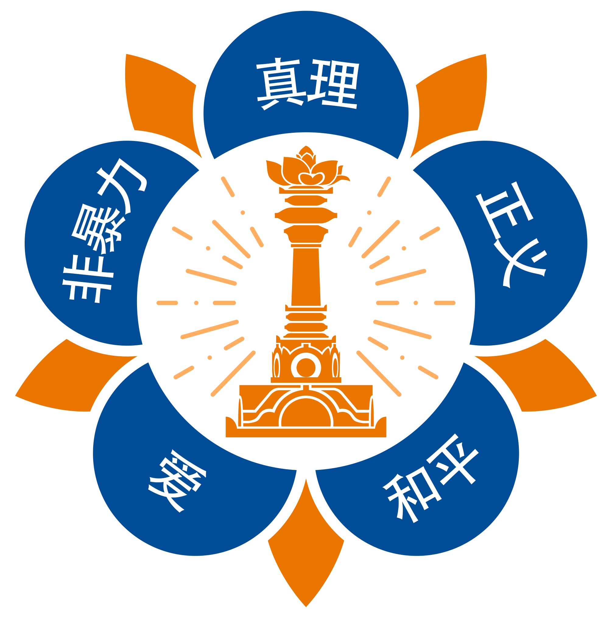 Also pictured in the logo is a tall pillar, called the sarva dharma stupa with a lotus flower on it. The sarva dharma stupa represents all religions and faiths of the world.