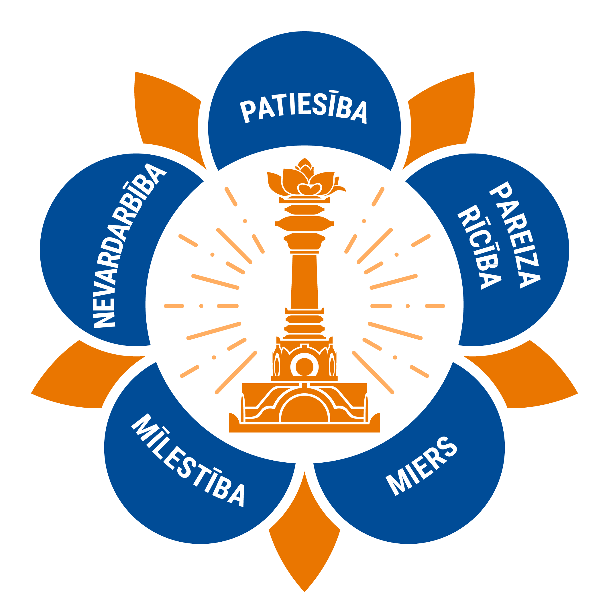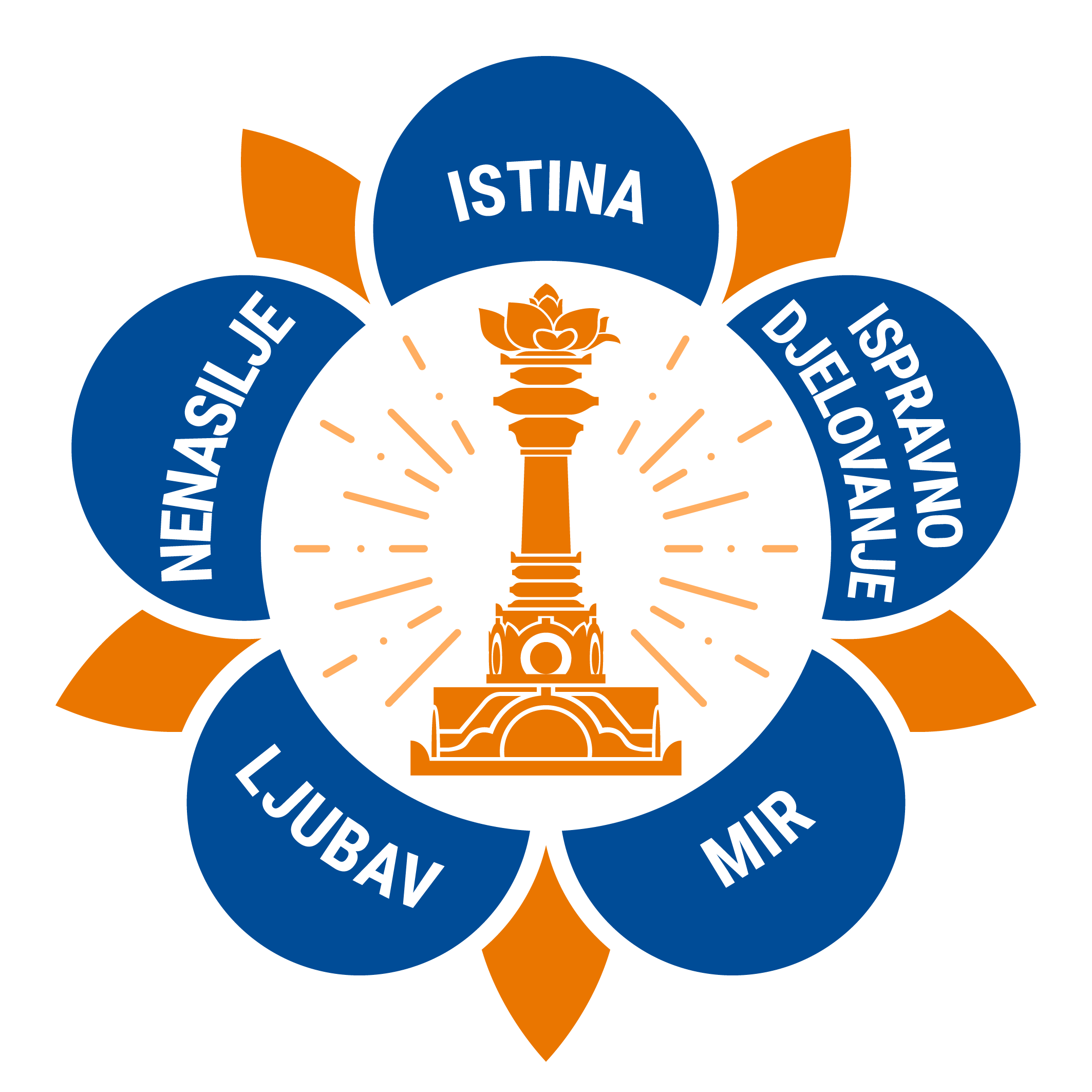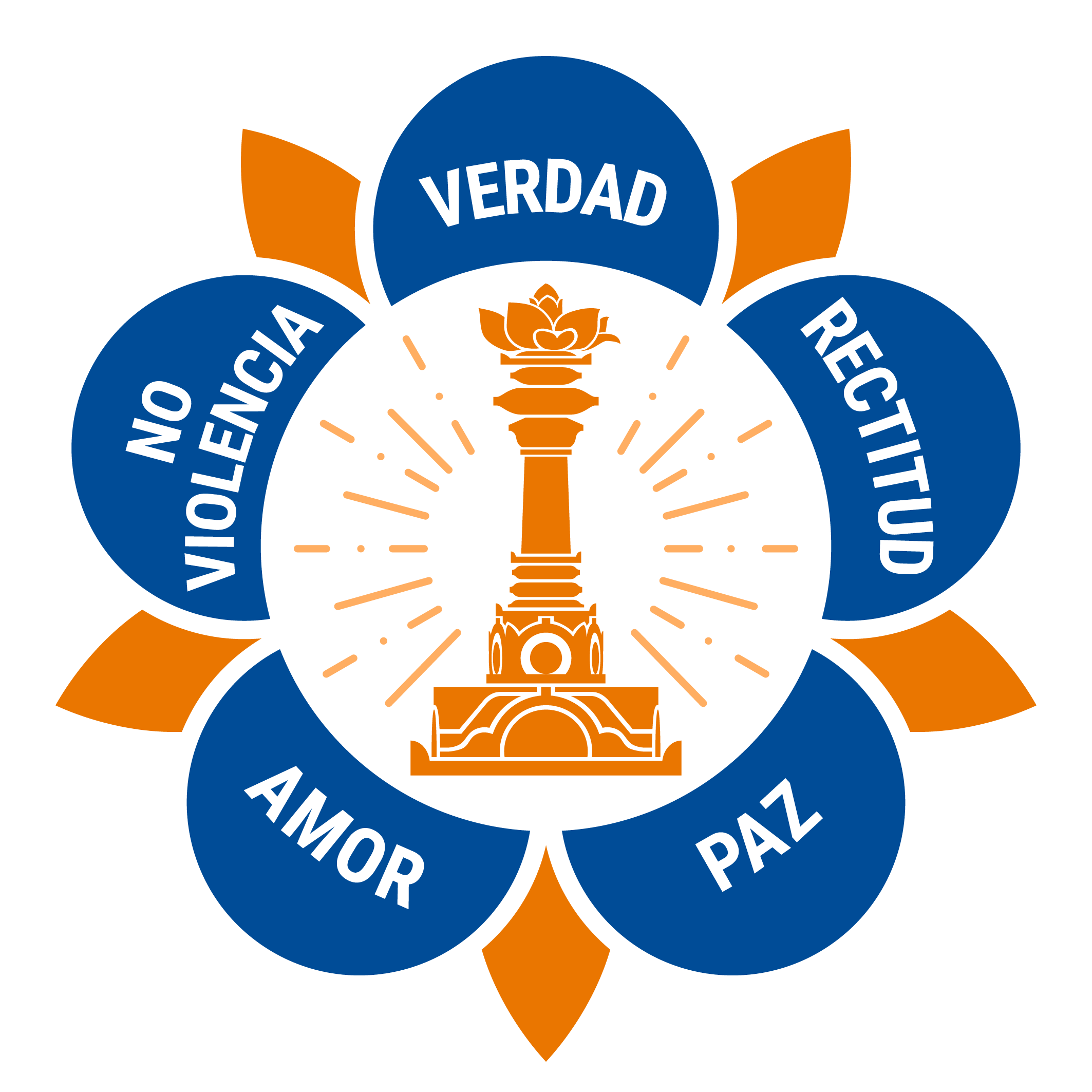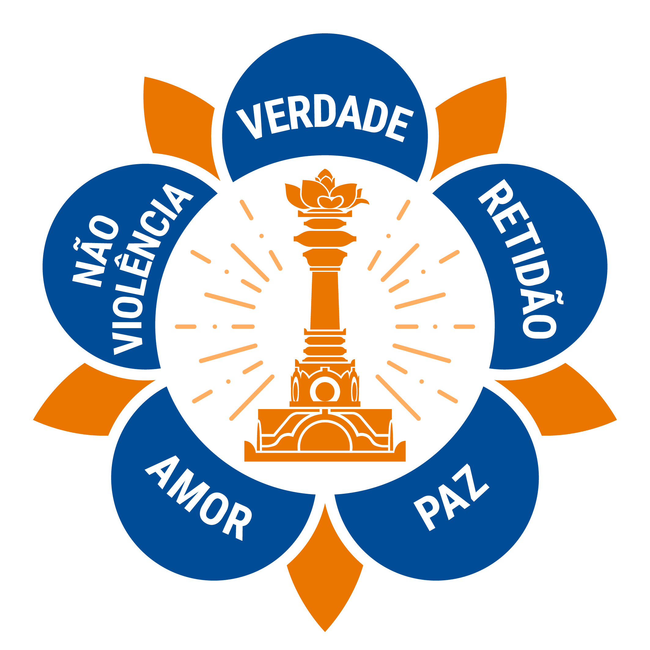 The logo of the SSSIO contains the five human values that form the foundation of Sri Sathya Sai Baba's teachings: truth (sathya), righteousness (dharma),peace (santhi), divine love (prema), and non-violence (ahimsa).